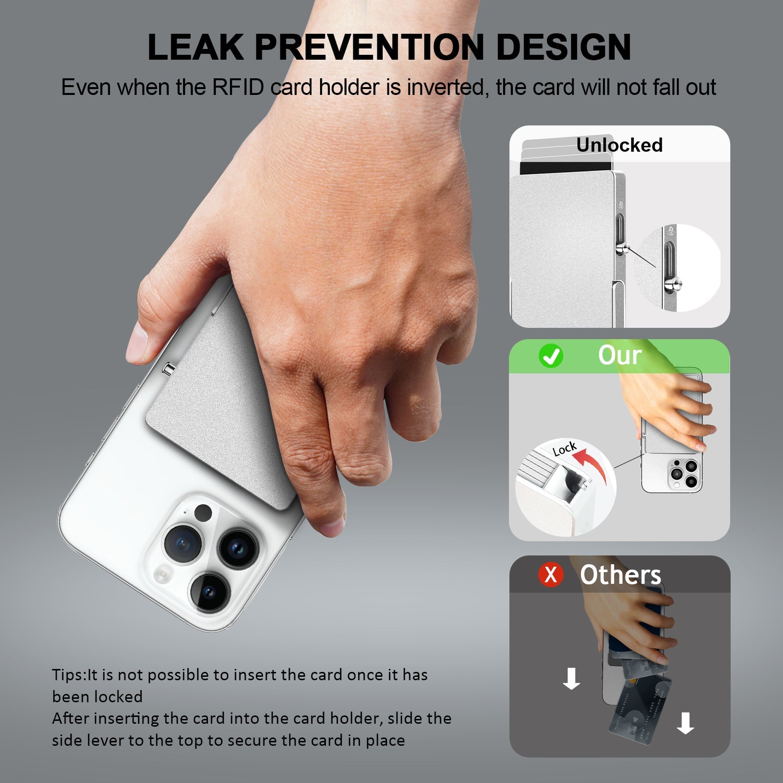 Prevent Theft, Leak Prevention : The card holder exit right side adopts a unique design,please push the metal switch to the top to lock cards to prevent your cards from falling out. No matter how you hold your phone, the cards will stay in the metal case safely.